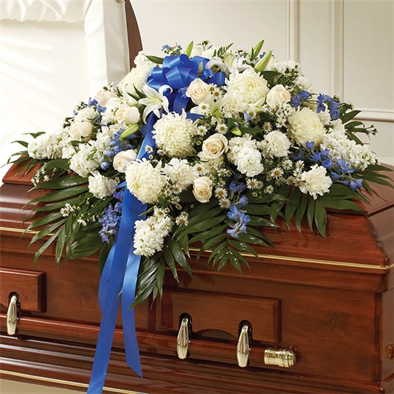 Honor a life so beautifully lived with a proud display of blue and white blooms. Our half casket cover, crafted with care and artistry by our expert florists with blue delphinium, white roses, and accented with a blue satin ribbon, is an unforgettable way to commemorate a lifetime of loving devotion. •Half casket cover arrangement of white roses, hybrid lilies, football mums, monte casino and stock, blue delphinium and emerald; accented with a blue satin ribbon •Arrangement measures approximately 18"H x 38"L x 28"D •Traditionally sent by the immediate family to the funeral home •Our florists use only the freshest flowers available, so colors and varieties may vary